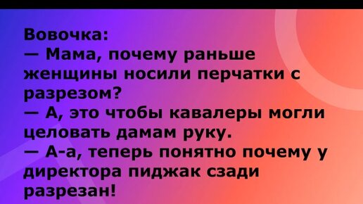 Вовочка: - Мама, почему раньше женщины носили перчатки с разрезом? - А, это чтобы кавалеры могли целовать дамам руку...