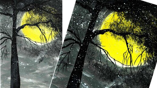 Зимний пейзаж. Нарисуем дерево под луной. Правополушарное рисование.