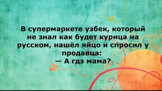 В супермаркете узбек, который не знал как будет курица на русском, нашел яйцо и спросил у продавца: - А гдэ мама?...