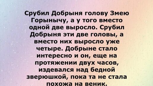 Срубил Добрыня голову Змею Горынычу, а у того вместо одной две выросло. Срубил Добрыня эти две головы, а вместо них выросло...