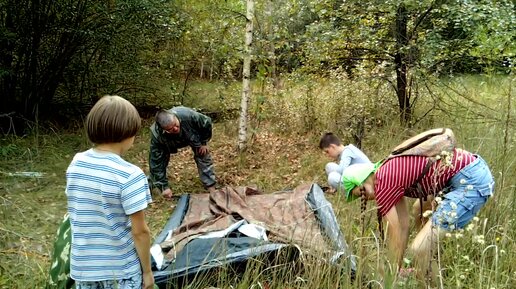 Наставник учит детей устанавливать палатку