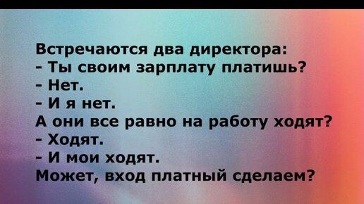 Встречаются два директора: - Ты своим зарплату платишь? - Нет. - И я нет. А они все равно на работу ходят? - Ходят. - И мои...