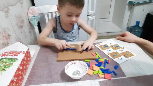 Новогодний подарок сыну. Ребенок собирает детскую мозайку с молотком и гвоздями
