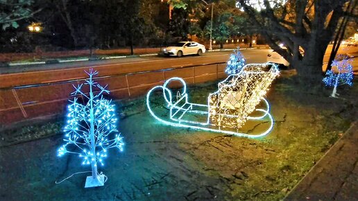 На Курортном проспекте под Новый год стоят сани, а снега нет и рояль под деревом весь в елочных игрушках