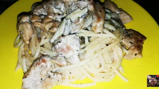 Спагетти с куриным филе и шампиньонами.