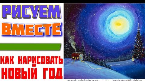 Рисуем вместе новогодний ночной пейзаж с домиком, снеговиком и нарядной елкой - Художник Рыбаков
