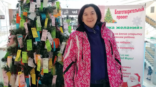 Ёлка желаний, люди несут подарки. Закупка продуктов к праздничному столу