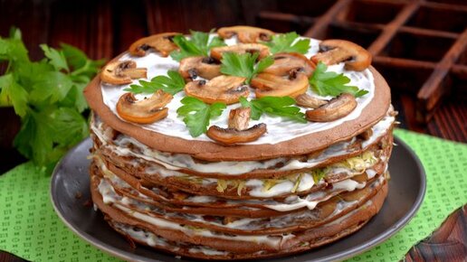 Почетный гость на празднике. Печёночный торт с грибами и сыром