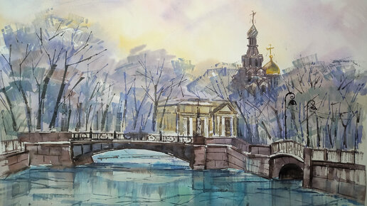 И снова рисуем зимний Питер, мосты и лед. Подробно.