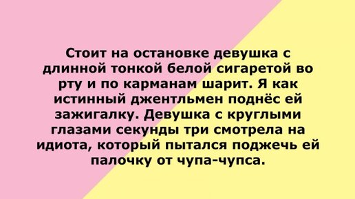 Стоит на остановке девушка с длинной тонкой белой сигаретой во рту и по карманам шарит. Я как истинный джентельмен поднес ей...