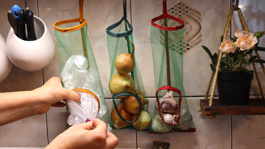 Купила мелкую пластиковую сетку для окон и смастерила из неё удобную систему хранения для кухни