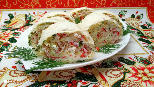 Рулет из лаваша с крабовыми палочками, сыром и яйцом.