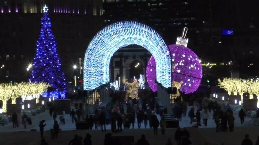 Прогулка вечером по Москве в новогодние праздники на Поклонной горе. Виды на монумент Победы, музей Победы и Главную аллею