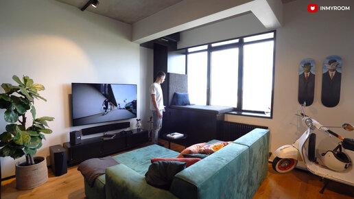 Невероятно стильная гостиная в однушке, в которой замаскировали наружный блок кондиционера и разместили мопед