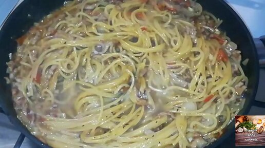 Спагетти с фаршем и помидорами черри.