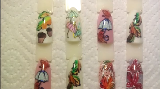 Дизайны ногтей, зонтики, дубовый лист, желуди, кленовый лист и каштановый лист.
