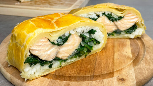 Готовится просто, съедается быстро. Слоёный пирог с сёмгой, шпинатом и рисом