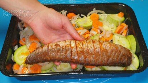 Запекаю в духовке рыбу хек с кабачками, морковью, луком и приправами (делюсь рецептом запеченной рыбы)