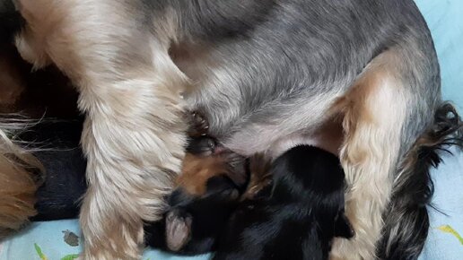 Мама собачка кормит свое потомство. Маленькие щенки йорка