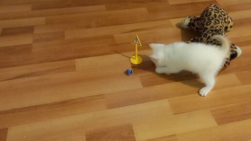 Осмотр владений. Белый котенок нашел резиновую игрушку