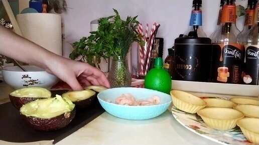 Вкусная закуска на праздничный стол. Тарталетки с авокадо и креветками с соком лайма.