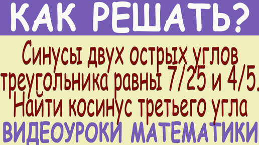 Найти косинус третьего угла треугольника, если синусы двух острых углов равны 7/25 и 4/5. Простое решение