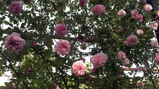 Цветение плетистой розы Камелот и плетистой розы Поль Трансьен