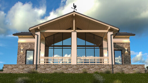 Проект дома со вторым светом на склоне и с видом на лес с прудом