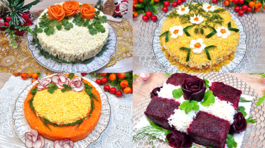Не знаете как украсить красиво салаты, предлагаю вам 4 праздничных салата на стол, гости будут в "шоке".
