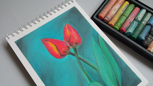 За окном снег, а у меня есть два тюльпана. Рисую их масляной пастелью