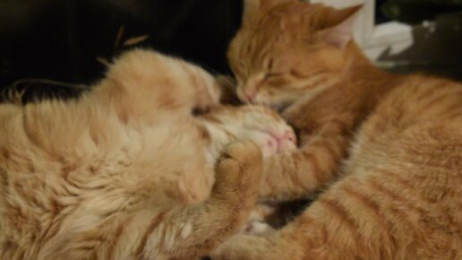 Котята Рыжик и Малюська. Перед дракой надо противника покусать и полизать.