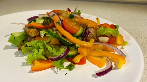 Овощной горячий салат с мясом.