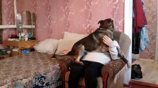 Овчарка просится на руки. Любит целоваться и возмущается, когда его ругают.