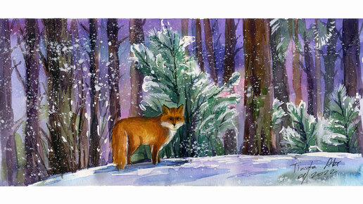 Рисуем лисицу, пейзаж зимнего леса