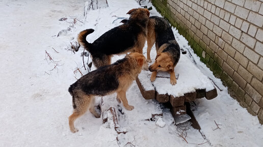 Трое бывших щенков с рынка резвятся по снежку. Мы еле успеваем за ними наблюдать