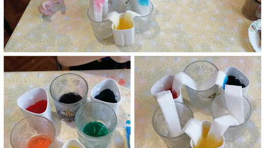 Эксперимент на кухне: перелили воду с помощью салфеток и посмотрели, какие цвета получаются при смешивании.