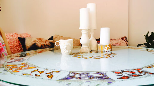 DIY. Идея росписи стеклянной столешницы кухонного стола. Стол с витражной росписью в интерьере.