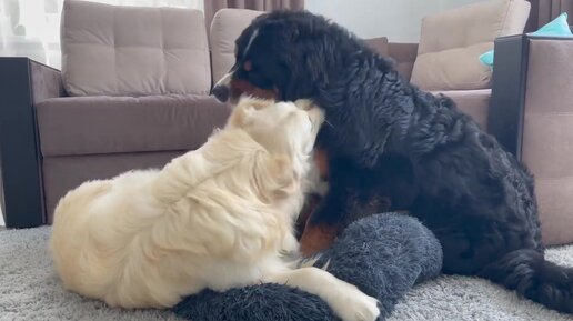 Бернский зенненхунд весело играет с золотистым ретривером дома