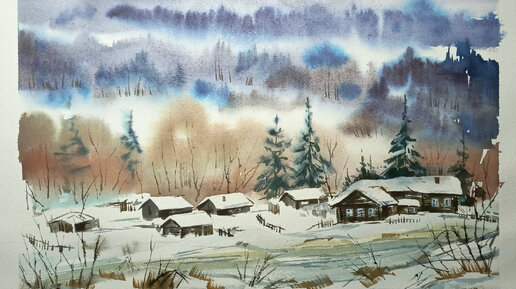 Рисуем быстро и просто. Зимняя деревенька, русский север, акварель