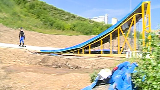 Новые технологии в спорте. Летний сноуборд - пластиковое покрытие для разгона, трамплин и надувная зона приземления