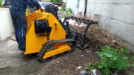 Вилы с гидрозахватом. Мини погрузчик GT700 производства DIKTUM. Уборка территории от веток и палок.