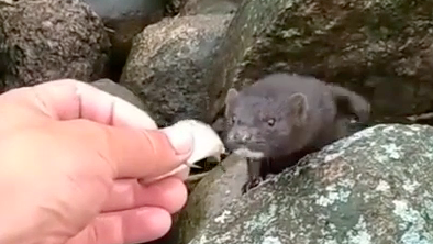 Ласка берет из рук рыбу