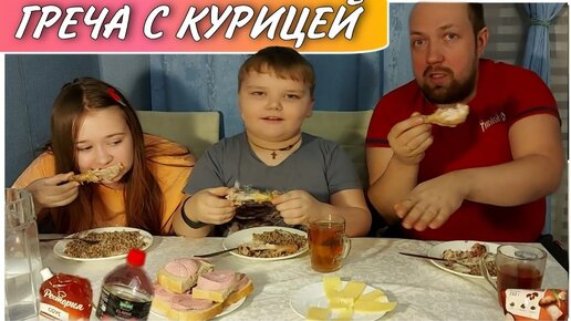 МУКБАНГ//Гречневая каша с жареной курицей и соевым соусом//Бутерброды с ветчиной и сыром/Моя семья