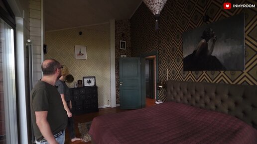 Оригинальный интерьер спальни в загородном доме с панорамными окнами