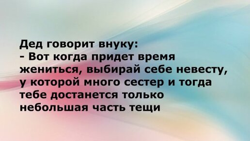 Дед говорит внуку: - Вот когда придет время жениться, выбирай себе невесту, у которой много сестер и тогда тебе достанется...