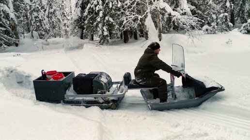Мотобуксировщик Ураган. Везу доски в санях, пассажира и груженный багажник.