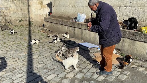 Добрый дедушка кормит стаю котиков в Стамбуле (Турция)😺