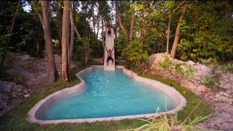Building complete and warm survival shelter, Bushcraft earth hut House with Swimming Pool
