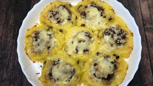 Вкусный ужин в духовке. Мясной фарш в картофельно-грибных гнёздах под сыром