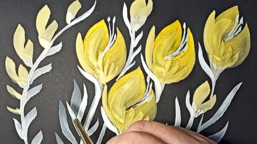 Золотые бутоны нарисованные гуашью на черной бумаге.